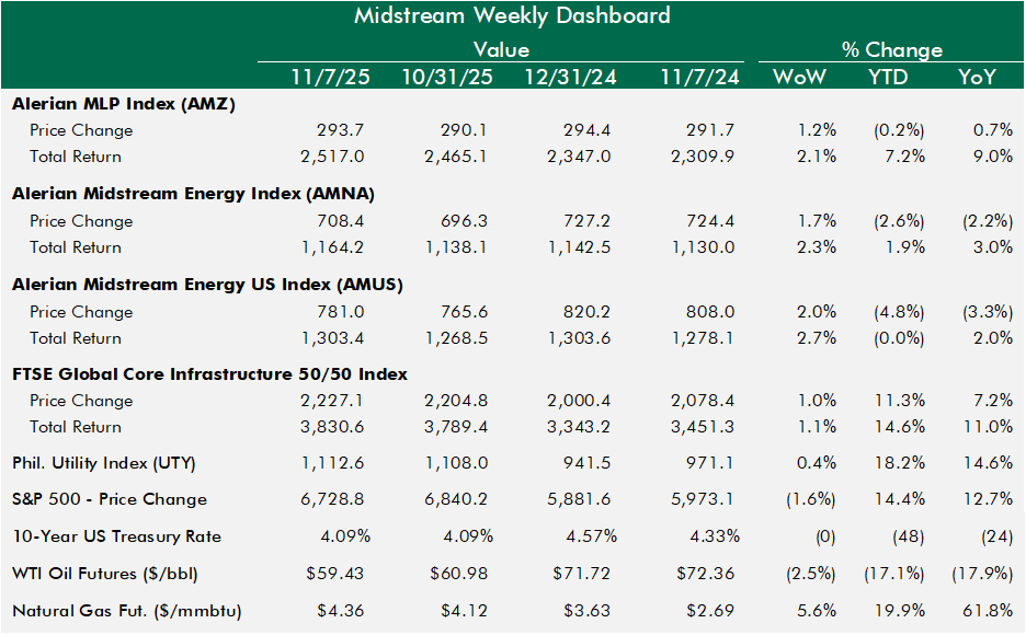 Energy stocks won the week within the S&P 500, and midstream did better than energy stocks, with 2%+ gains across all midstream benchmarks. Oil prices weren’t the driver, and midstream earnings weren’t great this week, but we’ll take the win. One week doesn’t make a trend, but it would be nice to see an ongoing rotation into companies that operate essential energy assets in an uncertain world. Midstream deserves more appreciation.