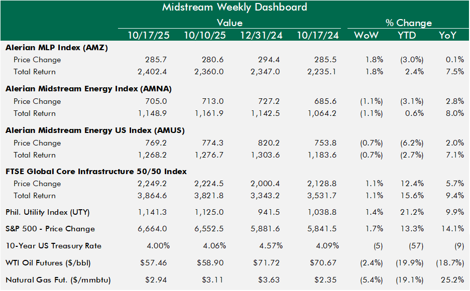 The market finished positive for the week, and so did utilities and infrastructure. But midstream was mixed, with all of Canada and most of U.S. corporations negative and most MLPs positive. The 10-year interest rate closed the week at 4.00%, mortgage rates are at their lowest point of the year so far, which seems good. But oil prices hit their lowest point in nearly 5 years, which is not good for sentiment around energy stocks and midstream stocks. The AMNA return so far this year is only slightly above 0%, counting the dividends. That is way off the pace of the market, utilities and infrastructure, but its much better than the -20% moves in commodity prices.