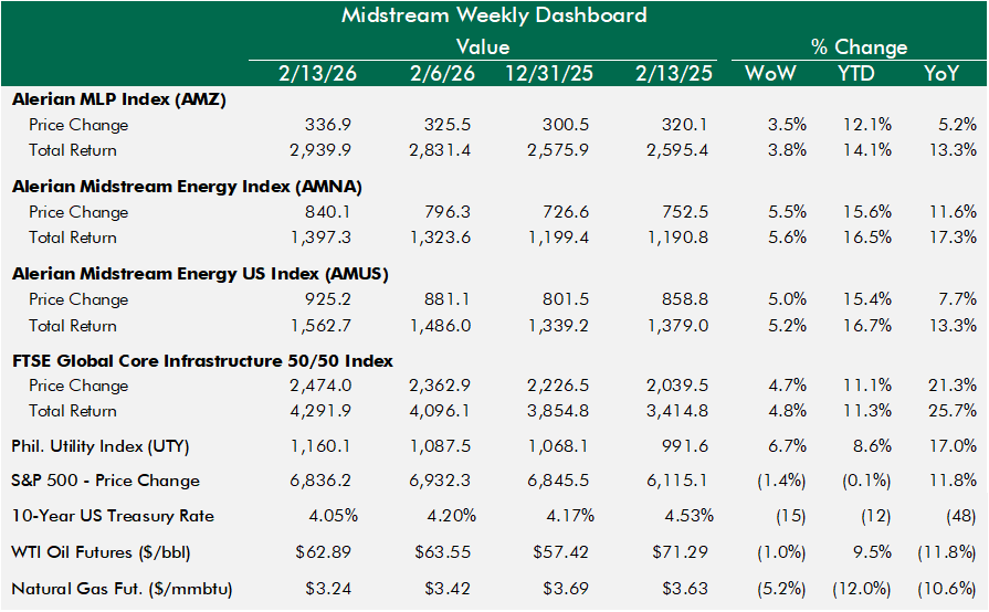 Midstream was a big winner this week, benefitting from several converging forces. First, earnings releases were generally positive, headlined by the Williams analyst day and the 10% EBITDA CAGR, then punctuated by the big Canadian pipeline companies that reported Friday. The second big force supporting midstream this week was the violent AI disruption trade that again ripped through the market, leading to rotation to hard asset related companies more immune to AI disruption. Finally, interest rates dropped 15 basis points in the flight to safety trade that helped income-oriented stocks like midstream stocks to outperform.